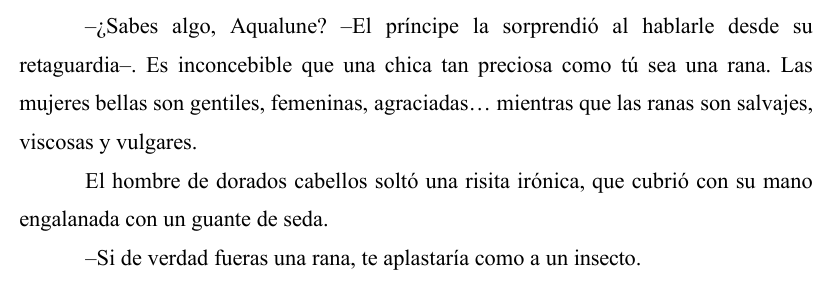 Un relato de unas trece páginas que concebí espolvoreando un poco de cuento de hadas (de los hermanos Grimm y Andersen, "los que dan miedo") y un poco de atmósfera gótica sobre una historia que gira en torno a ranas, amor y personas que no son lo que parecen ser.